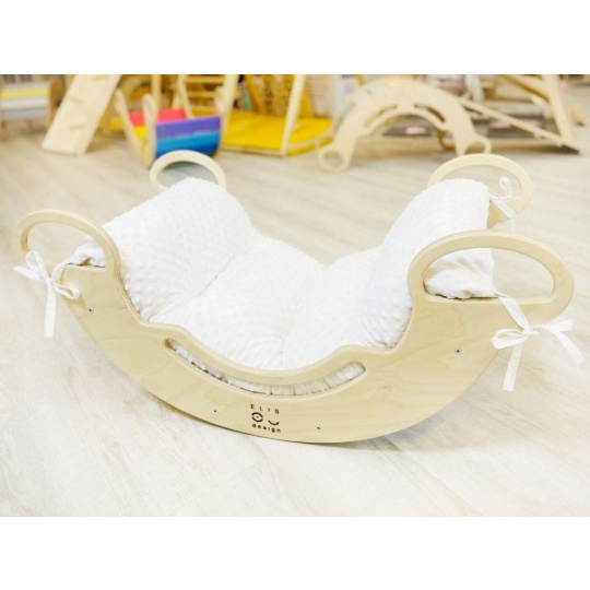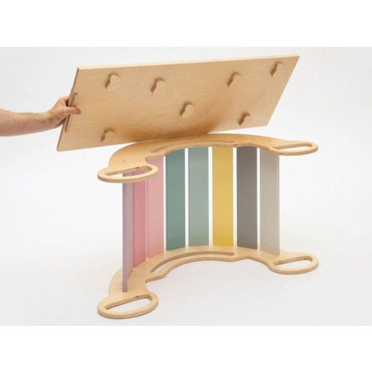 Montessori dětská houpačka smile 6in1 jistě vykouzlí úsměv na tváři vaší holčičky nebo chlapce. Svým designem, pastelovými barvami a širokým úsměvem bude denně lákat děti k zábavné hře i příjemnému pohoupání. Její využití je všestranné, může být houpačkou, skluzavkou, prolézačkou, skrýší i sedačkou, při doplnění oboustranným prknem i dětským nábytkem. Oboustranné prkno není součástí houpačky. Díky jemným pastelovým barvám je vhodná do každého interiér. Vyrobená je z těch nejkvalitnějších materiálů, ručně dohladka opracovaná a lakovaná barvami s atestem. Montessori houpačka smile je širší než naše Montessori houpačky 5in1, proto k této houpačce nabízíme i speciální oboustranné prkno, které je doplňkem k houpačkám smile. Díky prknu snadno proměníte houpačku smile v dětský stoleček. Oboustranné prkno není součástí houpačky, pro využití houpačky jako nábytku je nutné prkno samostatně dokoupit..