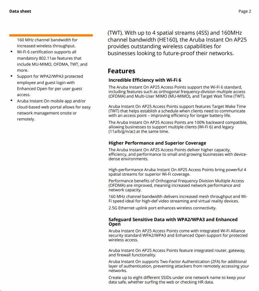 | Ultra-high-speed performance for high-density small businesses. Perfect for gaming, boutique hotels, tech start-ups and professional offices. The rise of the remote and hybrid workplace has placed increased pressure on business networks. Existing Wi-Fi infrastructure is struggling to support the explosion of devices and bandwidthhungry applications - all contributing to spotty video calls and sluggish download speeds. The Aruba Instant On AP25, a 4x4 Wi-Fi 6 access point, is designed to meet the increasing volume of connected devices. Delivering superior performance, coverage, and speed at a competitive price, the AP25 is the perfect access point for small and growing businesses. The Wi-Fi Certified 6TM AP25 delivers faster Wi-Fi speeds, greater capacity, and reduced latency between access points and devices for a superior Wi-Fi experience. AP25 improves efficiency and reduces congestion for networks with many connected devices, making it ideal for high-density environments. And with 4x the capacity of 802.11ac access points, the AP25 provides exceptional user experience, allowing businesses to serve more customers with higher speed and less congestion. Features of the AP25 include orthogonal frequency-division multiple access (OFDMA), multi-user MIMO and target wake time (TWT). With up to 4 spatial streams (4SS) and 160MHz channel bandwidth (HE160), the AP25 provides groundbreaking wireless capabilities for businesses looking to boost performance and future-proof their networks. |