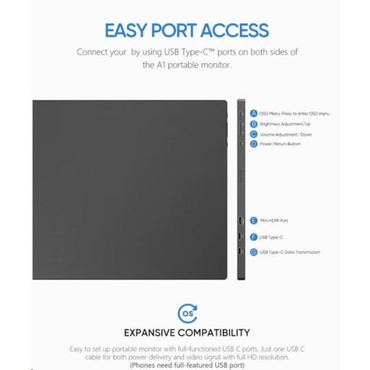 Monitor Arzopa vykazuje skvělou kompatibilitu, takže jeho používání bude velmi pohodlné. Je totiž vybaven portem Mini HDMI a dvěma porty USB-C. Bude dokonale fungovat s různými modely telefonů, notebooků, ale i konzolí, jako je Switch, Xbox a PS4.