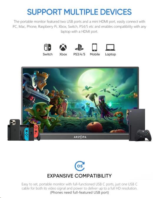 Arzopa Z1C funguje s celou řadou zařízení - od notebooků a smartphonů až po konzole (Xbox, Switch, PS4/5) a Raspberry Pi. Díky tomu je monitor vhodný pro různé aplikace - od kancelářské práce přes studium až po zábavu.