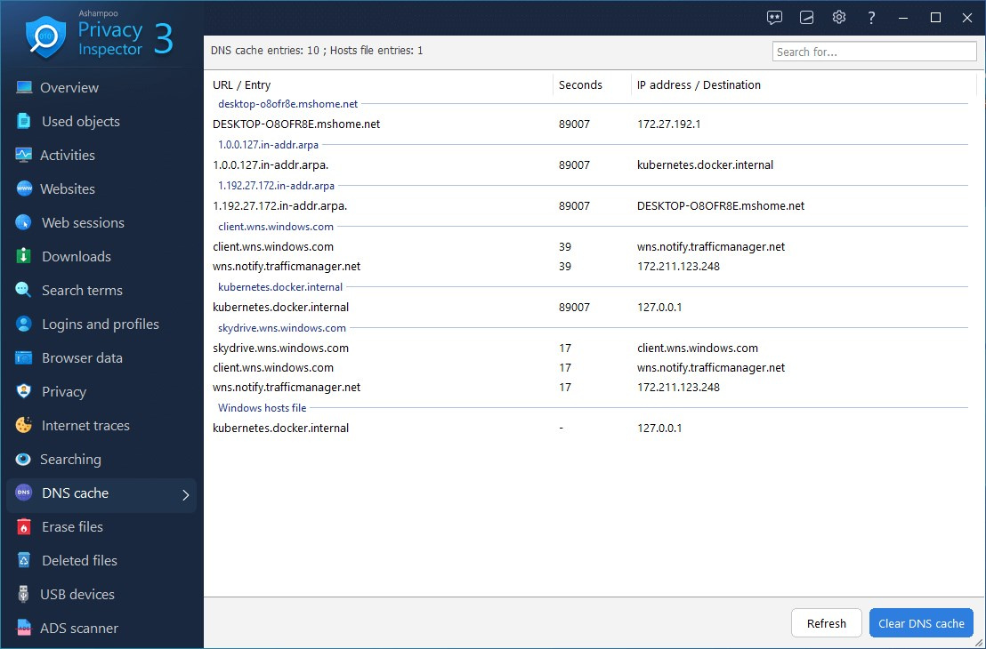 Věděli jste, že váš počítač ukládá IP adresy navštívených webových stránek do mezipaměti DNS, aby se zrychlilo načítání? Prohlížení se tak sice zrychluje, ale položky mohou zastarat nebo být během útoku zmanipulovány (DNS spoofing). S novým modulem DNS Cache máte vše pod kontrolou! Mezipaměť si můžete nejen podrobně prohlédnout, ale také ji snadno vymazat, když nastanou problémy. Můžete dokonce zkontrolovat podobně strukturovaný soubor hosts. To zajišťuje aktuální připojení a chrání vás před potenciálními bezpečnostními riziky!