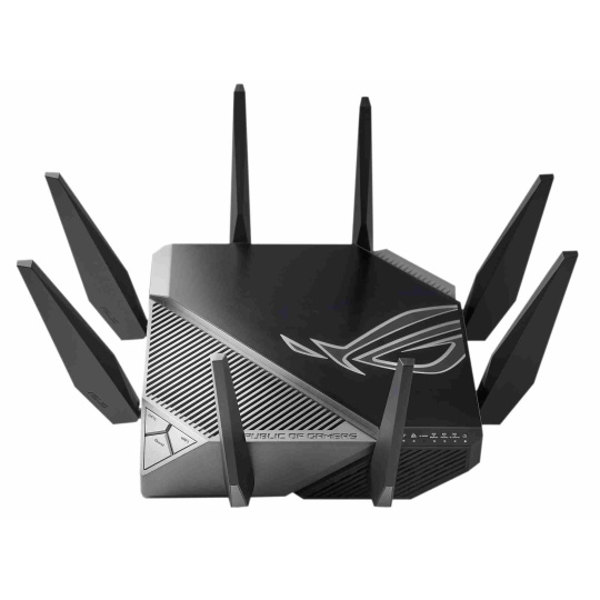 ROG Rapture GT-AXE11000 Třípásmový herní router GT-AXE11000 WiFi 6E (802.11ax), nové pásmo 6 GHz, 2.5G WAN/LAN port, kompatibilní s PS5, agregace WAN, VPN Fusion, tříúrovňová herní akcelerace, zabezpečení sítě zdarma a podpora AiMesh Standard WiFi nové generace – první třípásmový WiFi 6E router na světě zvyšuje rychlost až 11 000 Mb/s. Nové pásmo 6 GHz – Širší kanály a vyšší kapacita přinášejí vyšší výkon, nižší latenci a menší rušení. 2.5G WAN/LAN Port – Veškerý síťový provoz procházející přes 2.5G port má nejvyšší prioritu a 2.5G port tak dokáže plně využít potenciál WiFi 6. Výkon díky dokonalé technice – Čtyřjádrový procesor, pokročilý chladicí systém a optimalizovaný design antény přinášejí výpočetní schopnosti na zcela nové úrovni. Tříúrovňová herní akcelerace – Zrychlete přenos herních dat na každé zastávce, od vašeho zařízení až po herní server. RJ45 for Gigabits BaseT for WAN x 1, RJ45 for Gigabits BaseT for LAN x 4, RJ45 for 2.5G BaseT for WAN/LAN x 1 ROG Rapture Wifi 6 802.11ax Tri-band Gigabit Gaming Router Wifi 6 802.11ax 1148Mbps (2.4G) Wifi 6 802.11ax 4804Mbps (5GHz) Wifi 6E 802.11ax 4804Mbps (6GHz) OFDMA + MU-MIMO tech, 1024 QAM, Triple level Game Acceleration, Aura RGB lighting, ROG Boost Key, 2.5G Multi-Gigabit Gaming Port, WiFI Radar and Zero Wait DFS, AiProtection Pro, VPN Fusion Adaptive QoS, Bandwidth control, AiMesh, ASUS Roter APP (ROG theme).