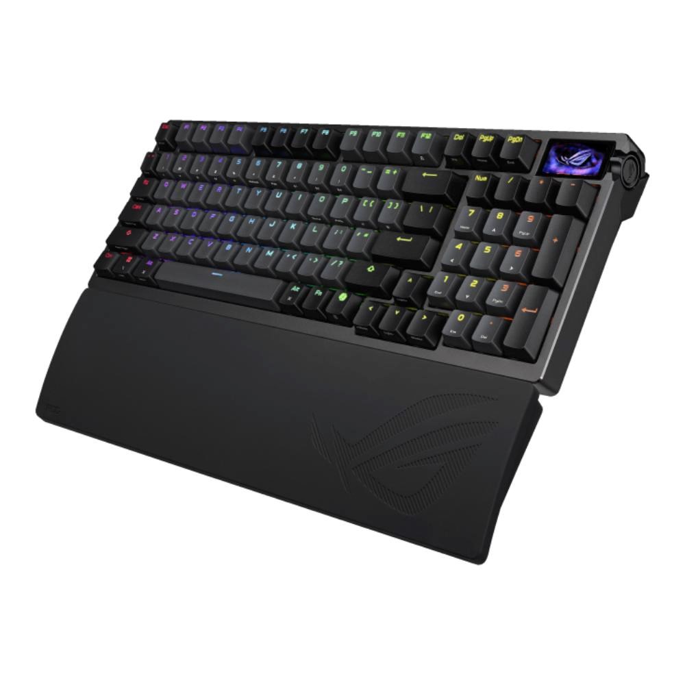 ROG Azoth 96 HE analogová herní klávesnice s vyměnitelnými magnetickými spínači ROG HFX V2 a senzorem ROG Hall. Nabízí OLED displej, třísměrný ovládací knoflík, trojí způsob připojení s bezdrátovou technologií ROG SpeedNova 8K, režim Zone, šestivrstvé tlumení a odnímatelné silikonové opěrky zápěstí.