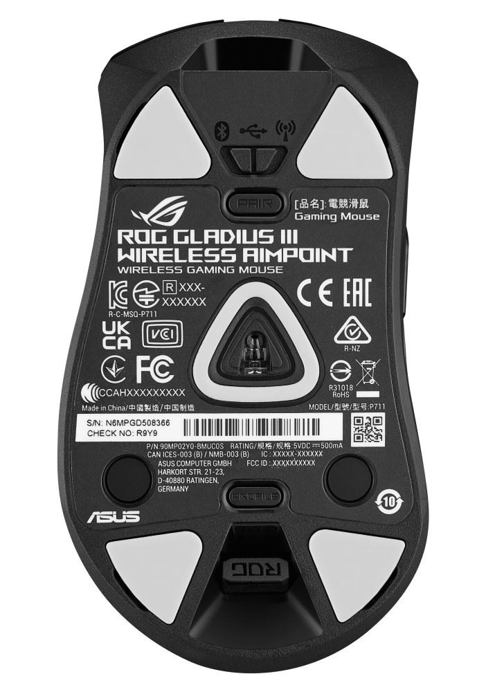 - Push-Fit Switch Socket II: Vyměnitelný design spínače pro snadné přizpůsobení; Gladius III Wireless AimPoint obsahuje mikrospínače ROG a je kompatibilní s dalšími 3pinovými mechanickými a 5pinovými optickými mikrospínači