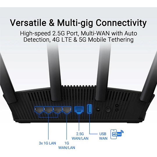 | Bezpečnost | AiProtection Pro, VPN, WPS support, WPA/WPA2/WPA3-Personal, WPA/WPA2-Enterprise, WPS, Let's Encrypt, DNS-over-TLS, SSH, Security Scan, Firewall, • Maximální počet filtrů klíčových slov firewallu :64, • Maximální počet filtrů síťových služeb firewallu :32, • Maximální počet URL filtrů firewallu :64 |
