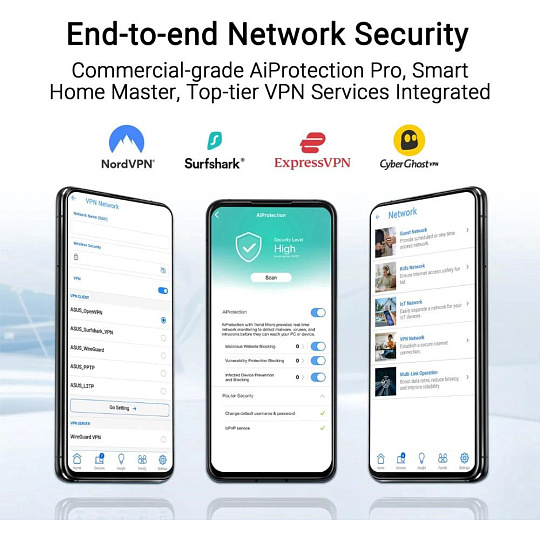 | AiProtection | AiProtection, • Hodnocení zabezpečení routeru, • Blokování škodlivých stránek, • Obousměrný IPS, • Prevence a blokování infikovaných zařízení |