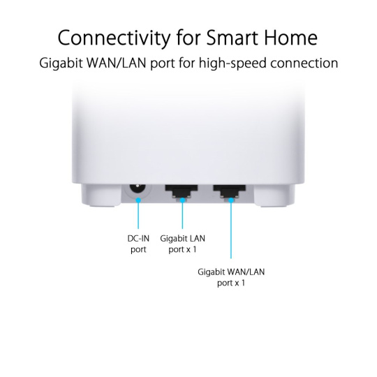 AX3000 Dual-band Mesh WiFi 6 System WiFi 6 (802.11ax): up to 574 Mbps (2.4GHz) WiFi 6 (802.11ax): up to 2402 Mbps (5GHz) Whole home mesh wifi system for large and multi-story homes Supports flexible SSID setting, wired inter-router connections AiProtection network security powered by Trend Micro Ethernet Gigabits WAN/LAN x 1, LAN x 1.