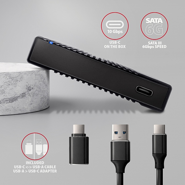 Žebrovaný hliníkový externí AXAGON EE25-GTR RIBBED box s USB-C 10Gbps rozhraním určený pro 2.5" SATA pevné disky nebo SSD. Spolehlivé připojení k počítači umožňuje oboustranný USB-C konektor na boxu spolu s dodávaným kabelem USB-C -> USB-A a redukcí USB-A -> USB-C.