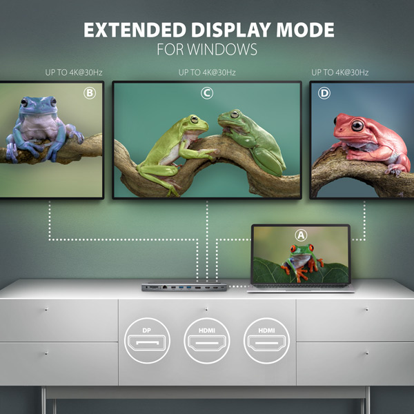 Každý ze tří video výstupů (2x HDMI + 1x DisplayPort) poskytuje kvalitní obraz až do rozlišení 4K/60Hz Ultra HD. Podporovány jsou také vysoké frekvence v oblíbených hráčských rozlišeních 2K/144Hz nebo FullHD/240Hz. I při připojení tří monitorů současně zvládne dokovací stanice zajistit rozlišení až 4K/30Hz na každém z nich. Díky podpoře HDR (vysoce dynamický rozsah) si můžete bez omezení vychutnat výrazně rozšířený rozsah barev a kontrastů. Pro správné fungování video výstupu je nutné, aby USB-C port notebooku podporoval DisplayPort Alternate Mode (DP Alt Mode) nebo Thunderbolt 3/4. Podpora výše uvedených max. podporovaných rozlišení a frekvencí vyžaduje připojení k počítači s DisplayPort verze 1.4.
