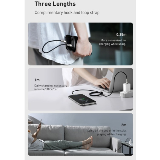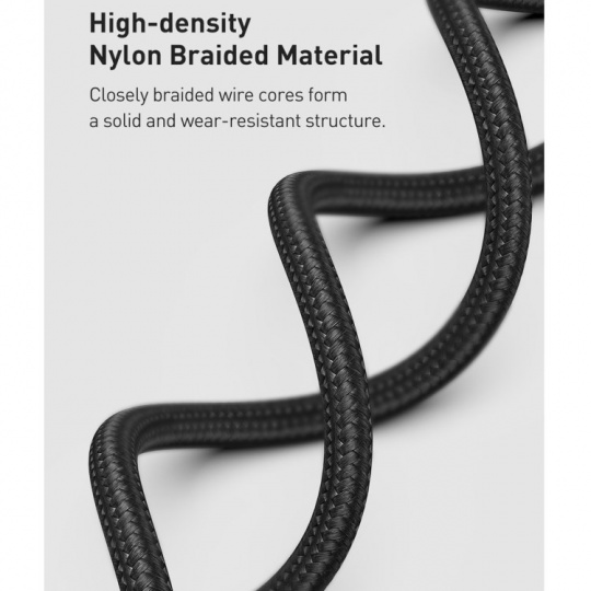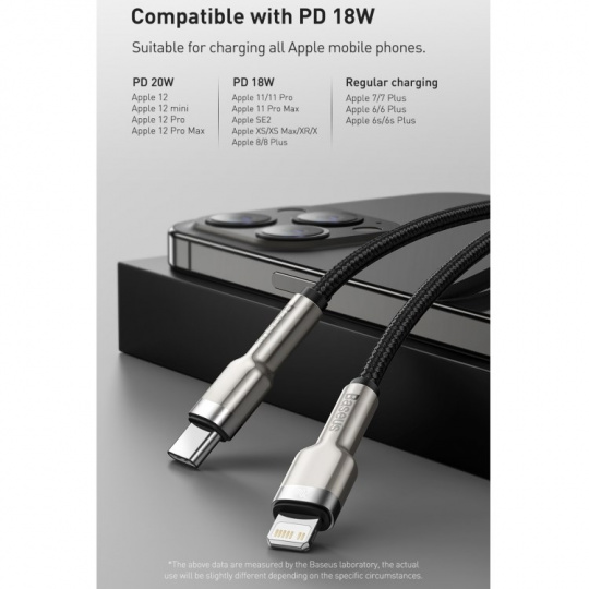 Kabel BASEUS Cafule Metal Series je odolný kabel, ve kterém jsou konce zástrček potaženy slitinou zinku, aby přežily dlouhé a intenzivní používání. Výrobek je také vybaven speciálním nylonovým opletením, které zabraňuje tření a chrání tak kabely uvnitř. Rovněž se zvýšila trvanlivost zástrček - prošly testem 10 000 připojení a byly speciálně profilovány tak, aby bylo možné kabel použít, i když je telefon v pouzdře. Kabel má funkci rychlého nabíjení PD 20W a přenosu dat. Jeho délka je 200 cm.