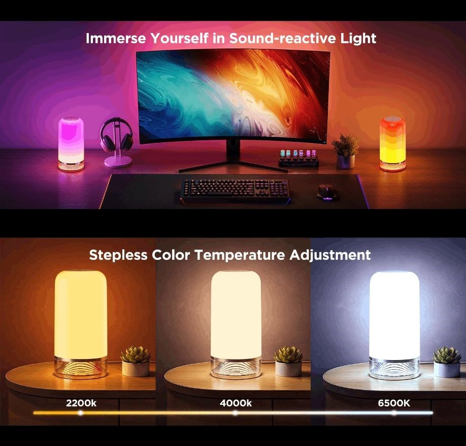 Govee LED Table Lamp 2 je vybavena funkcí vizualizace hudby prostřednictvím integrovaného mikrofonu, který synchronizuje světelné efekty s rytmem hudby. Díky této technologii lampa reaguje na každý tón a basovou linku, čímž vytváří dynamické osvětlení, které odpovídá atmosféře hudby, ať už jde o jemné melodie nebo energické rytmy. Nabízí různé světelné efekty, které se přizpůsobují různým hudebním žánrům, od jemných barevných vln až po pulzující vícebarevné záblesky, což z lampy činí dokonalý doplněk pro domácí večírky, relaxační chvíle nebo kreativní prostředí.