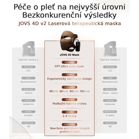 Maska JOVS 4D v2 se zásadně liší od běžných LED masek, protože využívá technologii FPT (cílená fotonová terapie) – profesionální laserovou terapii, která byla dosud dostupná pouze na klinikách. Na rozdíl od LED masek s rozptýleným a slabším světlem pracuje JOVS s přesně zacíleným laserovým světlem, které proniká hlouběji do pokožky. Intenzita laserového záření je až 6× vyšší než u běžně dostupných LED masek na obličej, což výrazně zvyšuje účinnost ošetření. Díky tomu nabízí JOVS 4D v2 výsledky srovnatelné s profesionálními ošetřeními, nikoli jen povrchovou kosmetickou péči.