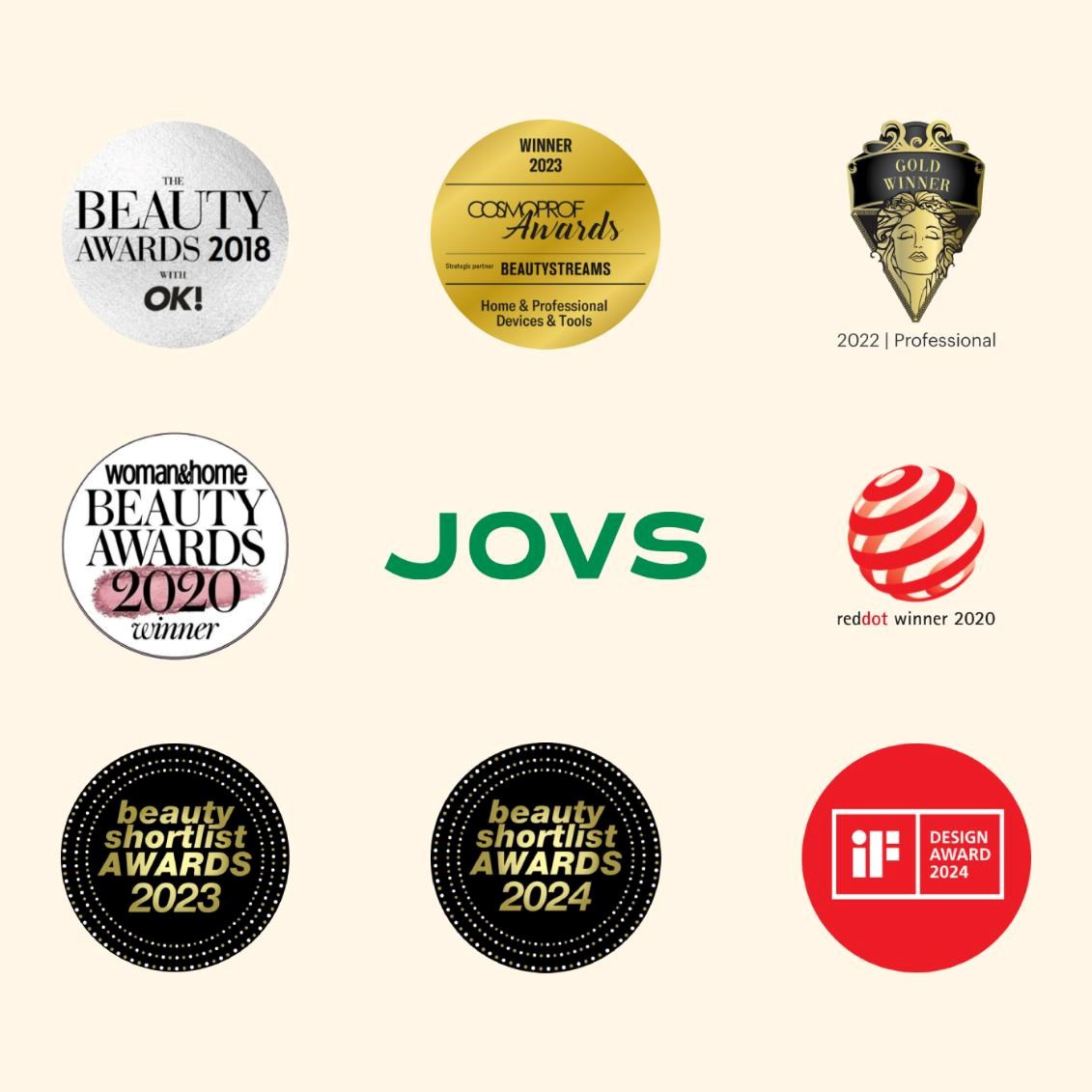 Společnost JOVS patří mezi světové lídry v oblasti estetických a kosmetických technologií, známá svými patentovanými inovacemi a důrazem na vědecký výzkum. Každý produkt prochází rozsáhlým testováním v různých skupinách uživatelů, aby bylo zajištěno maximální pohodlí, bezpečnost a účinnost. Značku JOVS si oblíbila řada předních Hollywoodských celebrit. Díky svému průkopnickému přístupu k designu a výkonu získala JOVS řadu prestižních ocenění za krásu a design – včetně Red Dot Award, iF Design Award, Cosmoprof Awards a Beauty Shortlist Awards.