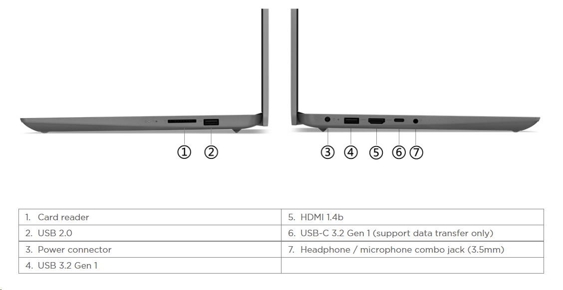 | Standartné porty | 1x USB 2.0 1x USB 3.2 Gen 1 1x USB-C® 3.2 Gen 1 (support data transfer only) 1x HDMI® 1.4b 1x Headphone / microphone combo jack (3.5mm) 1x Card reader 1x Power connector |