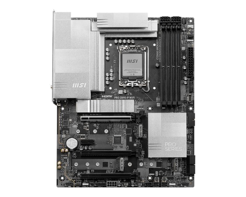 PRO Z890-P WIFI offers a simple design with a harmonious silver color scheme that perfectly matches both white and black PC builds. It is engineered with many exclusive features of MSI, a true Wi-Fi 7 with EZ Antenna, 5G LAN, Thunderbolt 4, PCIe 5.0 M.2 with EZ M.2 Shield Frozr II, and Supplemental PCIe Power, ready for the Intel® Core™ Ultra processors.