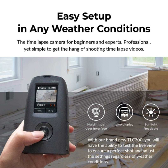 Kamera TLC300 je vybavena revolučním jednostránkovým designem pro nastavení parametrů časosběrného snímání, který integruje plán, interval snímání a nastavení obrazu do přehledného menu, což z ní činí uživatelsky nejpřívětivější profesionální časosběrnou kameru.