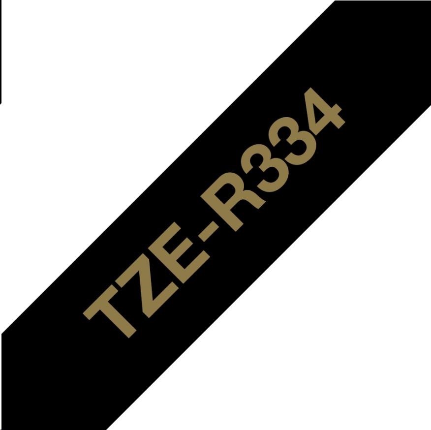 BROTHER TZE-R334 - kazeta TZ šířky 12mm, TEXTILNÍ páska 4m- pro tvorbu dárků - NELEPÍCÍ - ČERNÁ PÁSKA, ZLATÝ POTISK gold