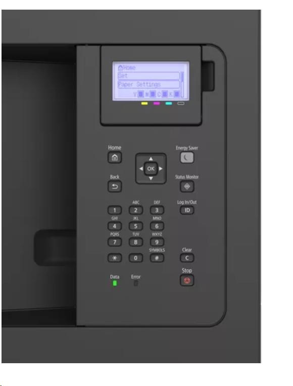 - Ovládací panelDisplej LCD s 5 řádky, 5 indikátorů LED (Online, Ready, Message, Job a Energy saver), tlačítka, číselná klávesnice s 10 tlačítky