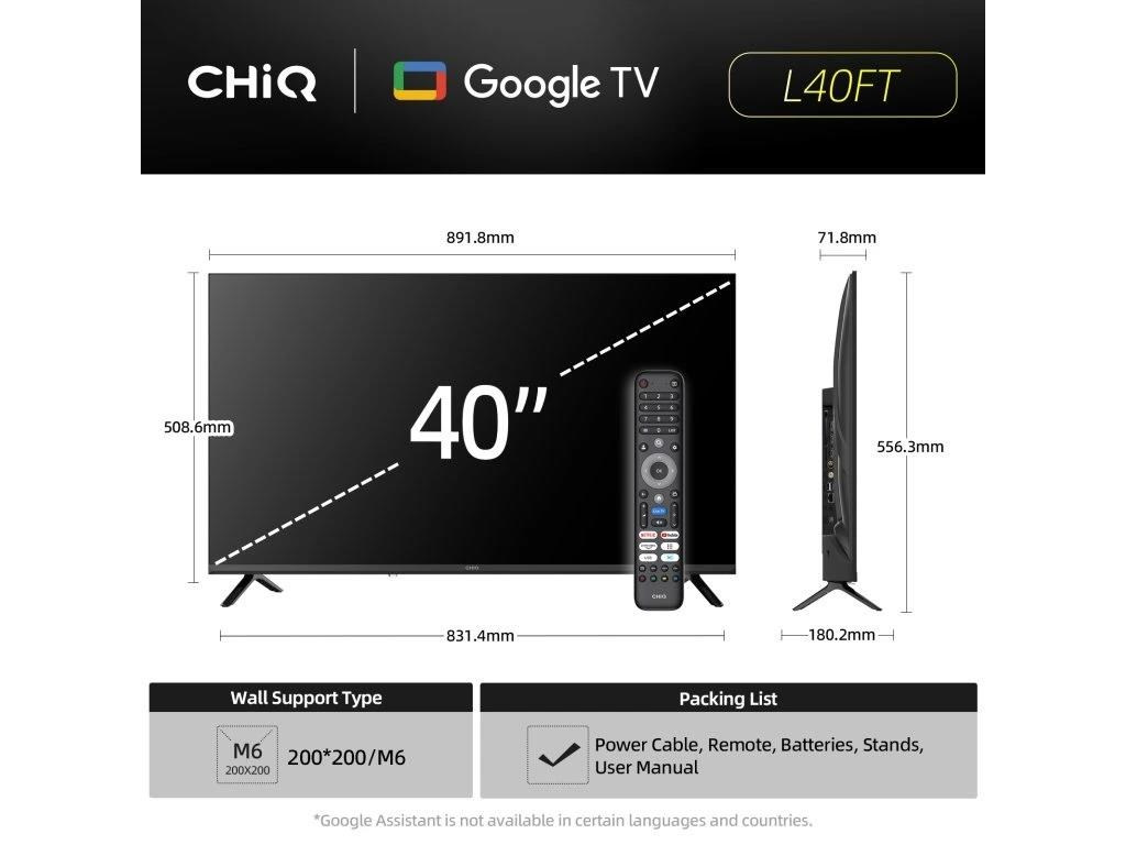 CHiQ 40“ L40FT, ultratenká, bezrámečková Smart Google TV s HDR10, HLG, obrazovkou s Full HD s rozlišením 1920 x 1080 pixelů, Dolby Audio a vylepšeným zvukem dbx-tv.