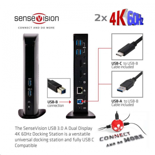 The SenseVision USB 3.1 Gen 1 Dual Display Docking Station has a convenient design and detachable stand, allowing it to be placed on your desk in horizontal- or vertical position. It's a productivity enhancing tool for any power user working in a (semi) professional environment.
