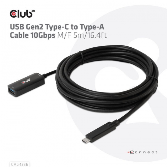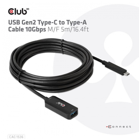 The Club 3D CAC-1536 USB Gen2 Type-C to Type-A Cable 10Gbps M/F 5m/16.4ft cable connects your Notebook, Tablet or Phone with USB Type-C output to your favorite existing Peripherals, Accessories and Chargers featuring the common USB Type-A plug. It enables Data and Power over a single cable and both ways. This cable supports USB 3.2 Gen 2. SuperSpeed+ data up to 10Gbps and up to 900mA output for Downstream charging or powering your USB Type-A enabled Notebook, Tablet or Smartphone.