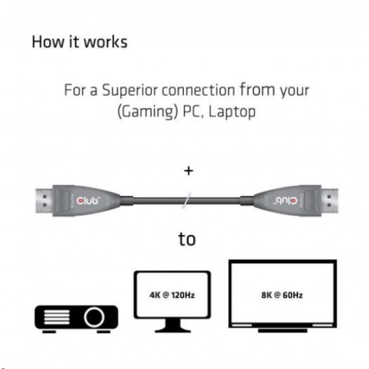 The Club 3D CAC-1079 is an Active Optical Unidirectional DisplayPort™ Cable that allows support for 8.1Gbps per channel. It supports 4K at 120Hz resolution as well as 8K at 60Hz and HDR formats. This optical fiber cable can be applied to outdoor displays, LED signboards, home cinema displays, conference rooms, medical imaging equipment or security systems to transfer audio and video signals.