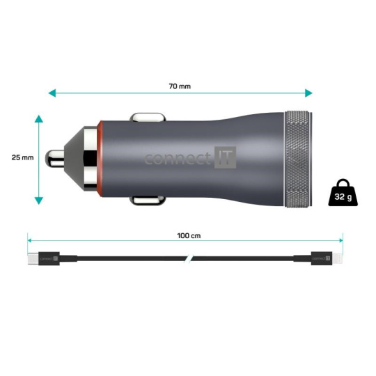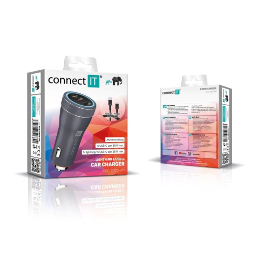CONNECT IT InCarz Duplex nabíječka do auta, 1x USB-C, 1x Lightning, šedá