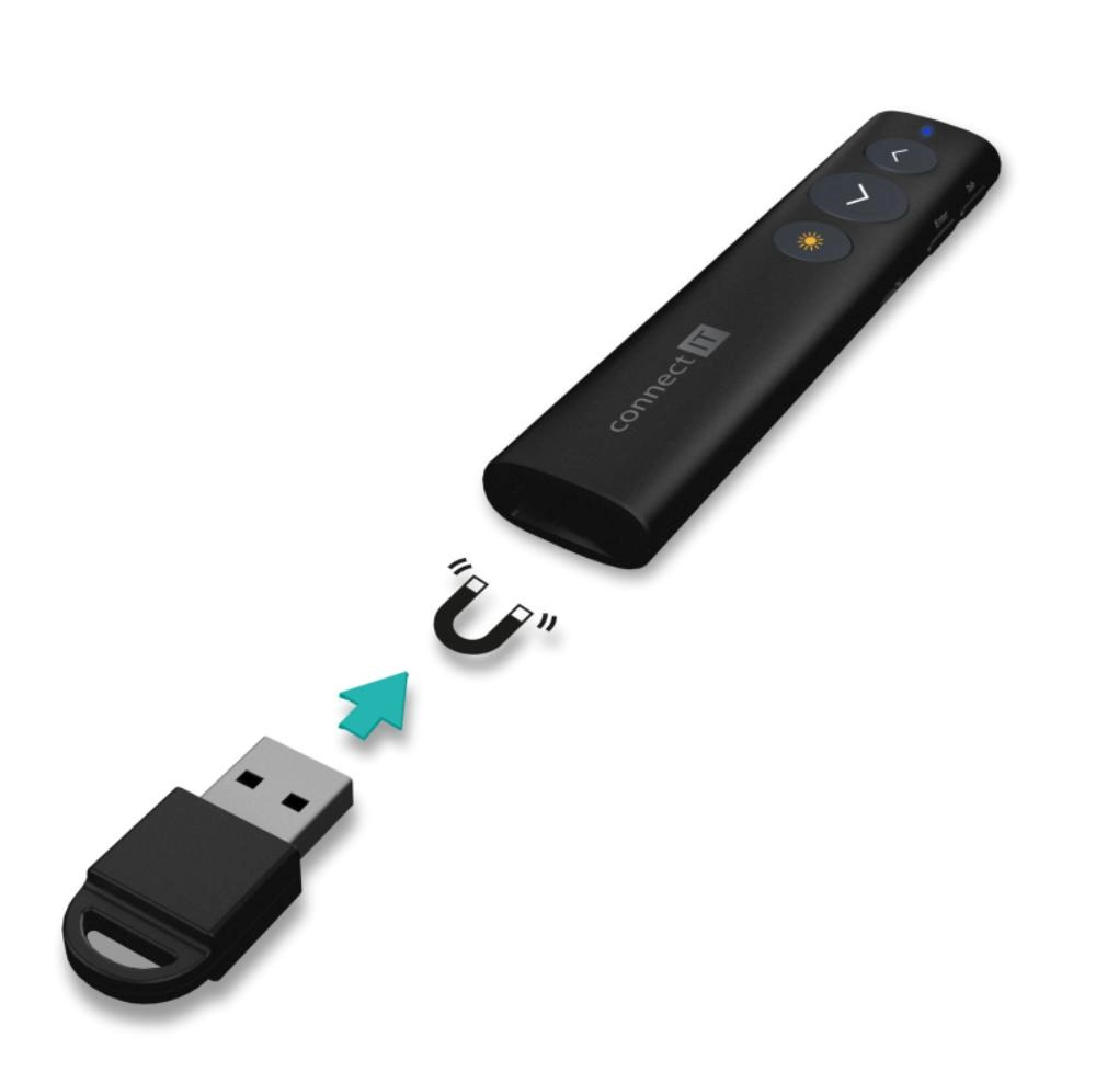 Optimální kombinace bezdrátového prezentéru a laserového ukazovátka z vás udělá profesionála na jakékoliv poradě, přednášce nebo prezentaci. Zamilujete si ho díky jeho nízké hmotnosti a perfektní štíhlému tvaru padnoucímu do každé ruky. V zadní části se nachází praktická schránka na USB přijímač, který už nikdy neztratíte.