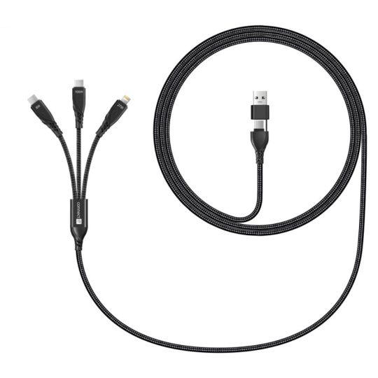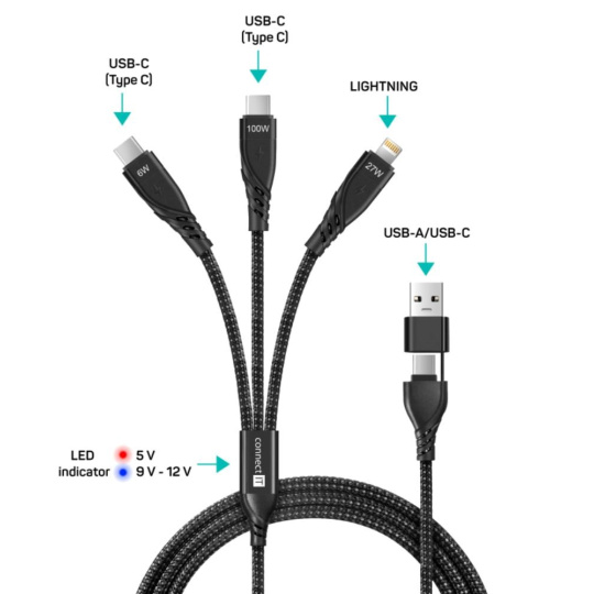 Univerzální nabíjecí kabel 6v1 pro nabíjení zařízení s konektory 2x USB-C,1x Lightning se vstupním konektrom USB-C a redukcí na USB-A. Umožňuje nabíjení až tří zařízení současně s podporou rychlého nabíjení pomocí max. proudového toku 5 A. Speciální manžetová nadstavba konektorů zaručuje lepší přístupnost k nabíjecím zdířkám mobilních telefonů v pouzdrech.