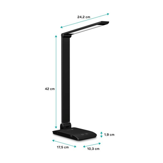 Díky sklopnému rameni a krku nastavíte dokonalý úhel pro jakoukoliv práci. Lampička disponuje USB-A výstupem s výkonem 5 W a dvěma praktickými dotykovými spínači, které umožňují zapnout/vypnout lampu, nastavit 3 úrovně jasu světla nebo nastavit barevnou teplotu světla ve 3 různých úrovních (3000/4000/6500 K).