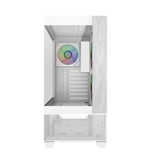 Model Elite 690 má čistý a moderní design a je vybaven dvěma panely z tvrzeného skla na přední a boční straně, které prezentují prémiové komponenty a osvětlení RGB. Přední panel kombinuje přírodní akcent s texturou dřeva se spodním sáním ze síťoviny, což přináší jak estetické teplo, tak efektivní proudění vzduchu. Díky rozsáhlému větrání na horní a spodní straně podporuje skříň univerzální konfigurace ventilátorů a chladičů, které umožňují výkonné vertikální chlazení. Ať už stavíte vysoce výkonnou předváděcí sestavu nebo stylovou stolní sestavu, Elite 690 poskytuje dokonalou rovnováhu mezi funkčností a formou.