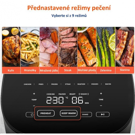 Samozřejmostí je také možnost manuálního nastavení teploty v rozmezí 75-230°C a doby přípravy jídla (až 60 minut).