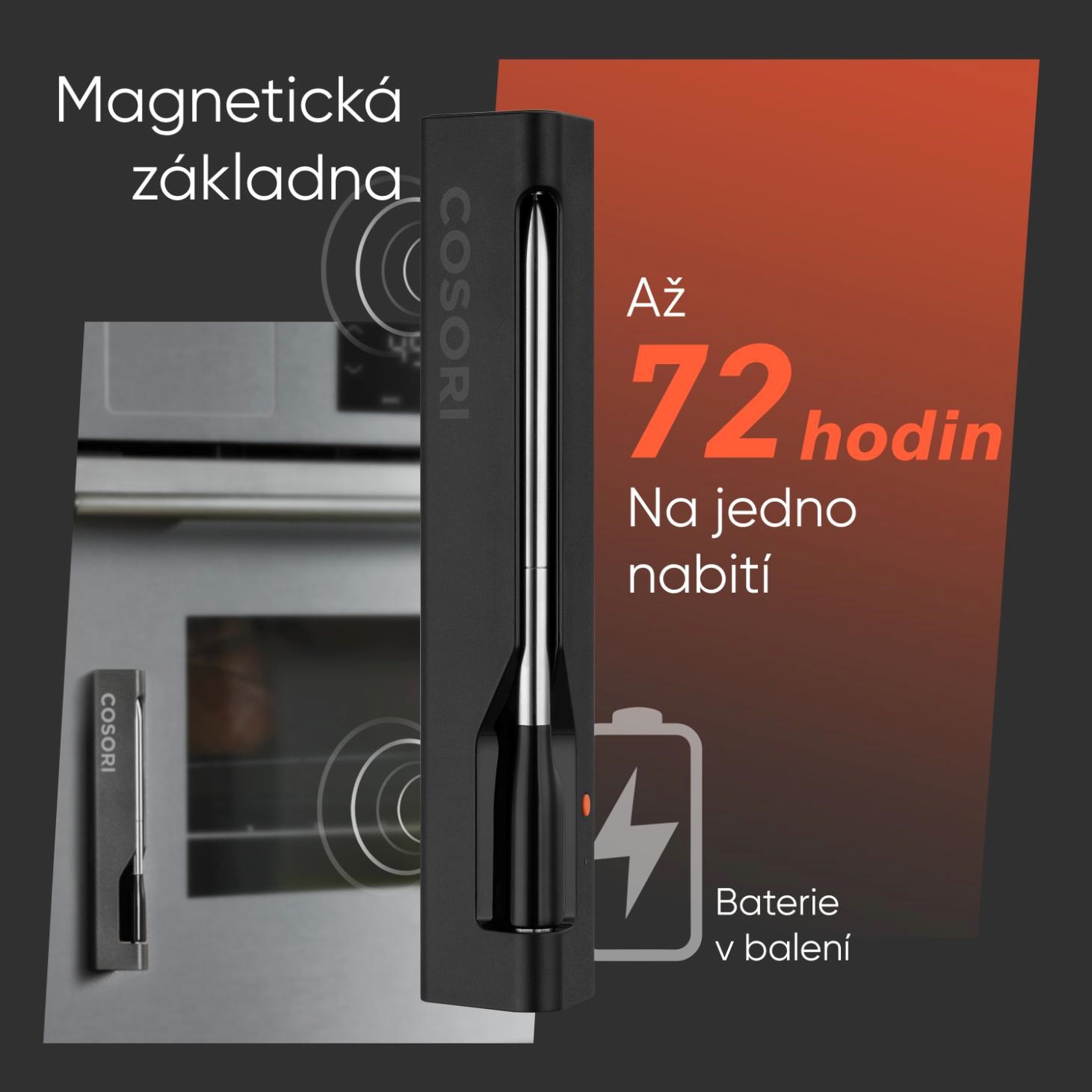 Teploměr COSORI získal prestižní ocenění iF Design Award 2023, což podtrhuje jeho dokonalý vzhled a robustní provedení. Sonda je vyrobena z nerezové oceli a keramiky, což zaručuje bezpečné a zdravé použití. Baterie sondy vydrží na jedno nabití až 72 hodin, což zaručuje nepřetržitý monitoring i během těch nejdelších příprav. Nabíjecí pouzdro má navíc integrovaný magnet, díky kterému ho můžete snadno připevnit na ledničku nebo jiný kovový povrch pro pohodlné uskladnění. Sonda je voděodolná s certifikací IP67, takže ji snadno umyjete ručně nebo v myčce. Vnitřní teplotní senzor měří maso v rozsahu 0° až 100°C s přesností ±1°C, zatímco senzor okolní teploty zvládá rozsah až do 300°C.