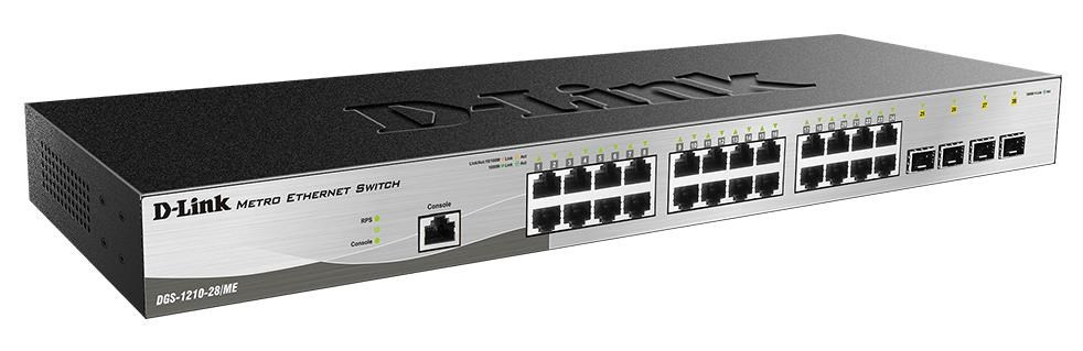 28-Port Gigabit Metro Ethernet Switch DGS-1210-28/ME Efficient and resilient Gigabit performance for Metro Ethernet applications. 24 x 10/100/1000BASE-T ports 4 x SFP ports Comprehensive Layer-2 features including Link Aggregation, Port-based Q-in-Q, and VLAN trunking Enhanced network security with IP-MAC Port Binding (IMPB), Access Control List (ACL), and IEEE 802.1X Embedded 6kV surge protection, sub-50ms recovery ERPS, and Dying Gasp provide optimal reliability 28-Port Gigabit Smart Switch with 4 SFP slots - 24 x 10/100/1000Mbps Auto-Negotiating Ports plus 4 x SFP Slot - RJ 45 Console Port - Smart Console Utility, web based management, compact CLI - Advance power saving features - Fanless design - Half-/Full-Duplex, auto-negotiation, Auto MDI/MDIX - IEEE 802.3x Flow Control - 802.3ad Link Aggregation - VLAN Trunking - Switching Capacity 20Gbps - Max packet forwarding rate 14.88Mpps - Jumbo frame 9,216 - Asymmetric VLAN, Auto Voice VLAN - Protocol based VLAN - MAC based VLAN - 802.1p priority queues - MAC/IP filtering - MAC/IP-based ACL - ACL flow based mirroring - 802.1X port-base Access Control, Port Security - Static Routing, 64 IPv4 static routes, 32 IPv6 static routes - 802.3ah Ethernet Link OAM, D-link Unidirectional Link Detection (DULD), Dying Gasp, DDM - Ethernet Ring Protection Switching (ERPS) - D-Link Safequare Engine - D-View 6.0 support - 19" Rackmount Installation - Surge protection - Firmware release 7 not backward compatible to hardware version A1 - optional redundant power supply DPS-200A (requires DPS-CB150-2PS).