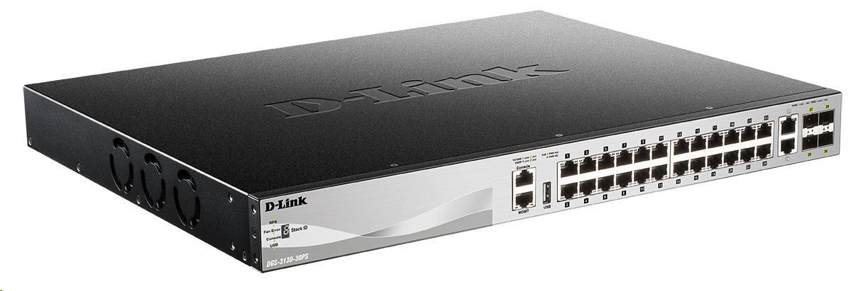 D-Link DGS-3130-30PS/E L3 Stackable Managed Gigabit PoE Switch, 24x PoE gigabit, 2x 10GBASE-T, 4x SFP+, 370W PoE