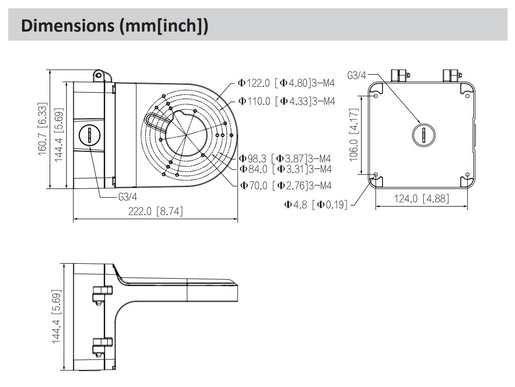 222.0 mm × 160.7 mm × 144.4 mm (8.66" × 6.33" × 5.68") (L × W × H)