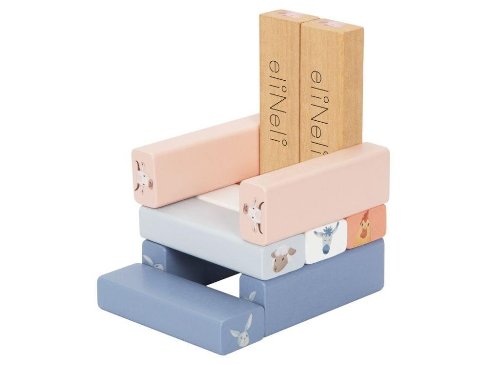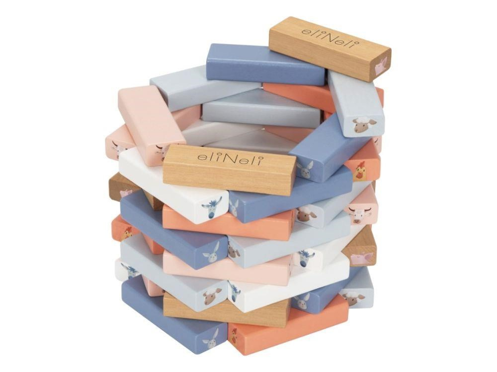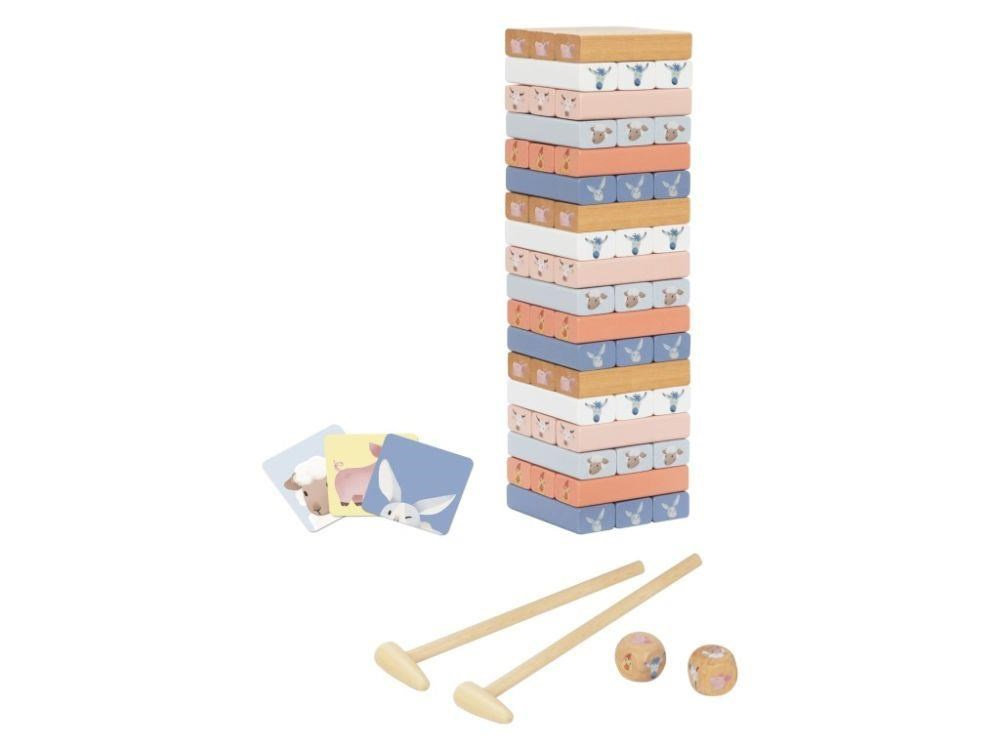 Dřevná skládací věž Jenga v příjemných pastelových barvách, s motivem zvířátek z farmy, s bohatým příslušenstvím, je zábavnou hrou pro děti i celou rodinu. Skládací věž nabízí spoustu možností ke hře s různou mírou obtížnosti. Ty nejmenší děti si pohrají s dřevěnými kostkami, větší děti postaví věž a pokusí se vytahovat kostky s motivem zvířátka, které padlo na kostce nebo si vylosovaly z kartiček a ti největší šikulové mohou kostky z věže vytloukat kladívkem..