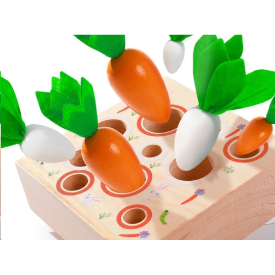 Dřevěná vkládačka pro děti v originální podobě, s mrkvičkami, nabízí spoustu zábavy, při které děti přirozeným způsobem zdokonalí své dovednosti. Vkládací mrkvičky různé velikosti, ve dvou barevných provedeních, a barevně označené otvory různé velikosti potrénují motorické dovednosti, koordinaci očí a rukou i logické myšlení.