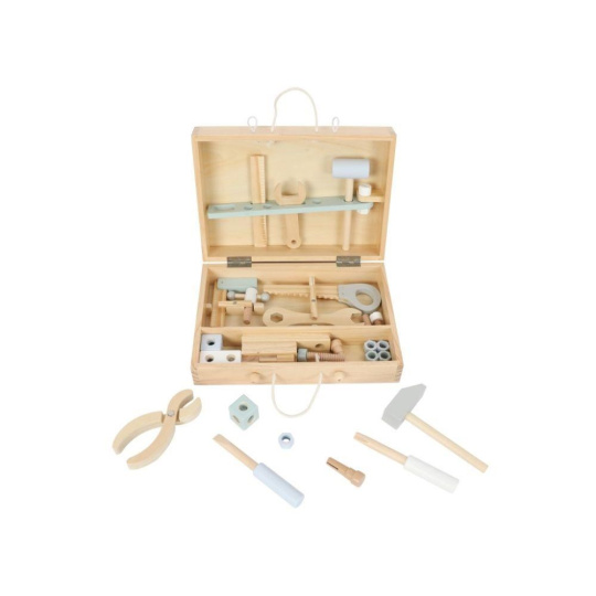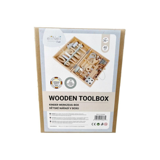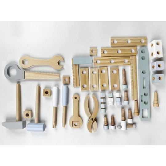 Dřevěné nářadí krásně a přehledně uložené v praktickém dřevěném kufříku nadchne každého malé kutila. Uvnitř kufříku najdou děti nejdůležitější nástroje včetně šroubů, matek a dalších doplňků. Kufřík s poutkem a členěným vnitřním prostorem usnadní dětem úklid i přenášení oblíbené hračky, děti tak mohou mít svou opravářskou a kutilskou sadu stále s sebou, na dovolené, na víkend k babičce..
