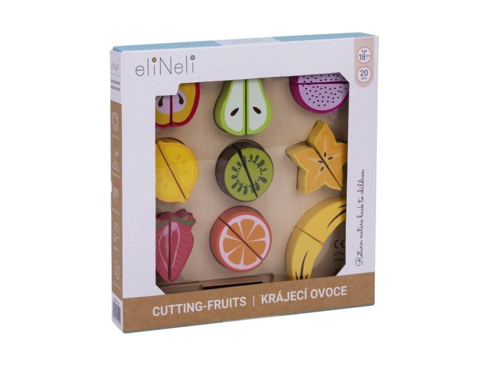Dřevěné ovoce ke krájení je hračkou, která by neměla chybět v žádné dětské kuchyňce ani dětském obchůdku. Toto krájení je pro děti zcela bezpečné. Půlky ovoce jsou spolu spojený suchým zipem, díky kterému děti ovoce dřevěným nožem jednoduše rozkrojí. Balení obsahuje 9 druhů ovoce, dřevěné prkénko i dřevěný nůž..