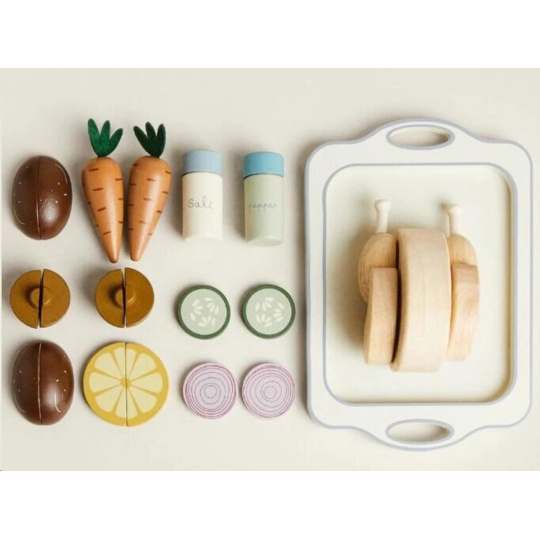 Dřevěné potraviny, zelenina, kuře, solnička s pepřenkou a velký tác usnadní dětem vaření a pečení v dětské kuchyňce. S touto dřevěnou sadou krájecích potravin bude pečení kuřete zábavnou hrou. Stačí ke kuřeti přidat oblíbenou zeleninu a potraviny, osolit, opepřit a vložit kuře do trouby. Upečené dřevěné kuře s oblohou na dřevěném tácu vypadá opravdu lahodně a je k nakousnutí.