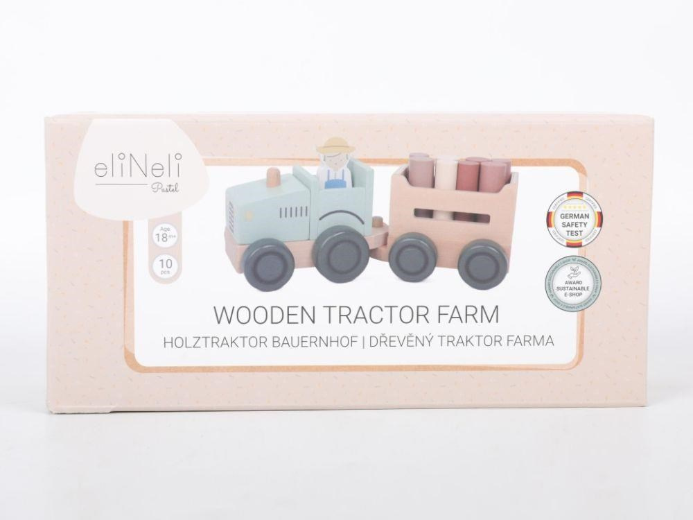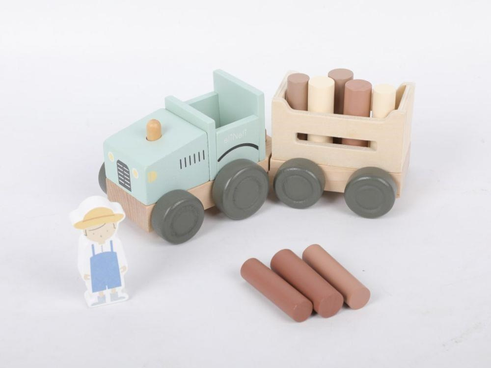 Parádní dřevěný traktor v jemné zelenkavé barvě, s traktoristou, vlečkou a nákladem v podobě klád (dřevěný válečků), promění děti ve skutečné farmáře. S tímto dřevěným traktorem se děti vydají do lesa na dříví, mohou převážet zvířátka z farmy a jakékoliv jiné hračky, kostky, co se jim podaří na vlečku naložit. Při hře s traktůrkem děti hrají role, zdokonalují motorické dovednosti a koordinaci očí a rukou..