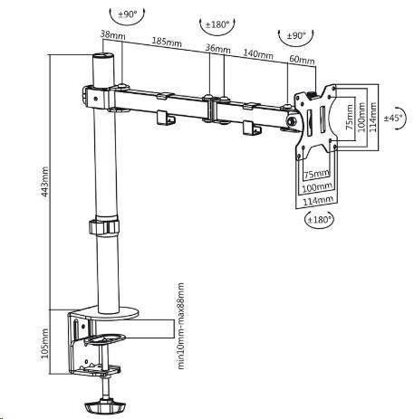 Držák monitoru na stůl Fiber Mounts SDM753 Výškově nastavitelný, otočný, sklopný stolní držák na monitor 13-32" Levný ale kvalitní držák na monitor s uchycením na stolovou desku - 2 typy uchycení součástí balení. Držák umožňuje monitor po zavěšení výškově polohovat, otáčet bez omezení do stran, naklápět. Držák podporuje VESA standardy 75x75 a 100x100, nosnost je 8kg. Černé provedení. Balení obsahuje instalační materiál. Technické údaje: nosnost 8kg na monitory s úhlopříčkou 13" až 32" (33cm až 82cm) držák podporuje VESA standardy 75x75 a 100x100 maximální vzdálenost od nosníku 459mm nastavení vzdálenosti od nosníku dle potřeby otáčení do stran dle potřeby +/- 180° nastavení náklonu +/- 45° součástí balení jsou 2 typy úchytů na stolovou desku úchytky na kabeláž solidní kvalita barevné provedení černé záruka 2 roky.