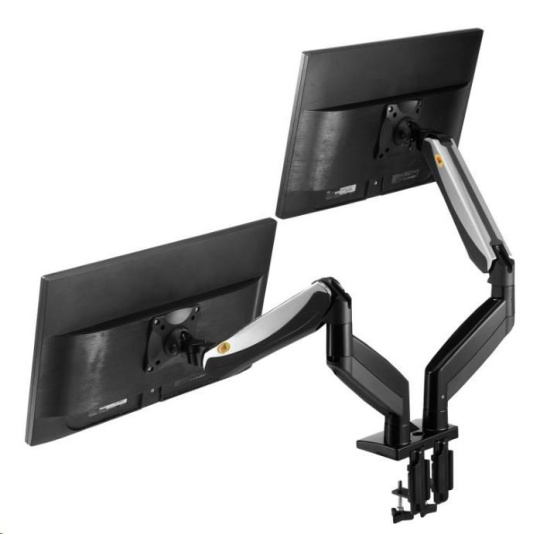 Nastavitelný držák pro dva monitory o hmotnosti od 2 kg do 8 kg, TOP design a kvalita Velmi kvalitní stolní držák pro zavěšení 2 monitorů na stolovou desku v kanceláři, pracovně nebo domácnosti. Monitory je možné nezávisle otáčet do stran, naklápět, posouvat. Možná je i úprava výšky od stolové desky, horizontální i vertikální otáčení obrazovky, korekce roviny. Pouze jednou nastavíte hmotnost Vaších monitoru na držáku a dále už nebute muset používat žádné nářadí. Velmi pěkný design, kvalitní bezpečná konstrukce, snadná manipulace. Polohovatelný stolní držák na dva monitory do kanceláře Technické údaje: celková nosnost 16kg zavěšení 2 monitorů s hmotnosti 2-8kg doporučujeme na monitory 19" až 30" náklon +55°/-8° natočení monitoru vpravo-vlevo o 180° otáčení ramena o 360° funkce PIVOT - otočení monitoru o 360° minimální výška monitoru od pracovní desky 230 mm (střed monitoru) maximální výška monitoru od pracovní desky 530 mm (střed monitoru) maximální tloušťka pracovní desky 90 mm nastavitelná vzdálenost do 625 mm Korekce roviny 2x USB port Systém pro skryté vedení kabeláže dva typy uchcení ke stolu - na okraj nebo skrz desku vestavěná pružina pro snadné nastavení výšky vysoká kvalita s důrazem na detail moderní design vyrobeno z hliníku a slitiny oceli snadná a rychlá instalace barevné provedení černé+chrom záruka 5 let Stolní držák F185A podporuje VESA standard: 75x75 100x100.