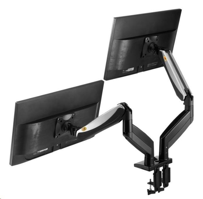 Nastavitelný držák pro dva monitory o hmotnosti od 2 kg do 8 kg, TOP design a kvalita Velmi kvalitní stolní držák pro zavěšení 2 monitorů na stolovou desku v kanceláři, pracovně nebo domácnosti. Monitory je možné nezávisle otáčet do stran, naklápět, posouvat. Možná je i úprava výšky od stolové desky, horizontální i vertikální otáčení obrazovky, korekce roviny. Pouze jednou nastavíte hmotnost Vaších monitoru na držáku a dále už nebute muset používat žádné nářadí. Velmi pěkný design, kvalitní bezpečná konstrukce, snadná manipulace. Polohovatelný stolní držák na dva monitory do kanceláře Technické údaje: celková nosnost 16kg zavěšení 2 monitorů s hmotnosti 2-8kg doporučujeme na monitory 19" až 30" náklon +55°/-8° natočení monitoru vpravo-vlevo o 180° otáčení ramena o 360° funkce PIVOT - otočení monitoru o 360° minimální výška monitoru od pracovní desky 230 mm (střed monitoru) maximální výška monitoru od pracovní desky 530 mm (střed monitoru) maximální tloušťka pracovní desky 90 mm nastavitelná vzdálenost do 625 mm Korekce roviny 2x USB port Systém pro skryté vedení kabeláže dva typy uchcení ke stolu - na okraj nebo skrz desku vestavěná pružina pro snadné nastavení výšky vysoká kvalita s důrazem na detail moderní design vyrobeno z hliníku a slitiny oceli snadná a rychlá instalace barevné provedení černé+chrom záruka 5 let Stolní držák F185A podporuje VESA standard: 75x75 100x100.