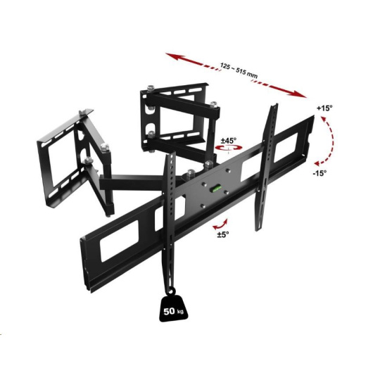 Držák Tv do rohu Fiber Novelty FN13 Speciální držák pro zavěšení Tv do rohů ale i na rovné stěny, na Tv 43-80", otočný +/- 60°, sklopný +/- 15°, vzdálenost od zdi 125-515mm, korekce roviny +/- 5°, instalační materiál, VESA standardy 75x75 až 800x400, nosnost 50kg Robustní televizní držák umožňující připevnění televizoru LCD LED a PLAZMA do rohů místností ale i na rovné zdi. Při instalaci do rohů díky uchycení na obou stěnách televizi snadno nastavíte do ideální pozice. Doporučená velikost televizorů je 43" až 80". Televizor je možné sklopit a to až o 15°. Podpora VESA 75x75 až 800x400, nosnost 50kg. V případě instalace na rovnou stěnu je nastavitelná vzdálenost 125-515mm a otáčení do stran +/- 45°, při instalaci do rohů se vzdálenost a otáčení mění vzávisloti od míry rozevření nástěnných ramen. Součástí televizního držáku je i integrovaná vodováha pro přesnou montáž a veškerý instalační materiál. Záruka 5 let. Televizní držák pro uchycení do rohu místnosti Fiber Novelty FN13 Technické údaje: nosnost 50kg podpora VESA standardu 75x75 až 800x400 ideální na televize s úhlopříčkou 43" až 80" otáčení do stran +/- 45° možnost náklonu +/- 15° vzdálenost od zdi 125 - 515mm korekce roviny +/- 5° integrovaná vodováha poctivá ocelová konstrukce instalace do rohů místností i na rovné stěny snadné nastavení televizoru do požadované polohy záruka 5 let.