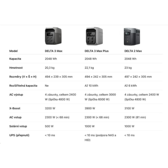 | Kompatibilní přídavné baterie | DELTA 2 Max, DELTA 3 Max Plus, DELTA Pro 3, DELTA 3 přídavná baterie |