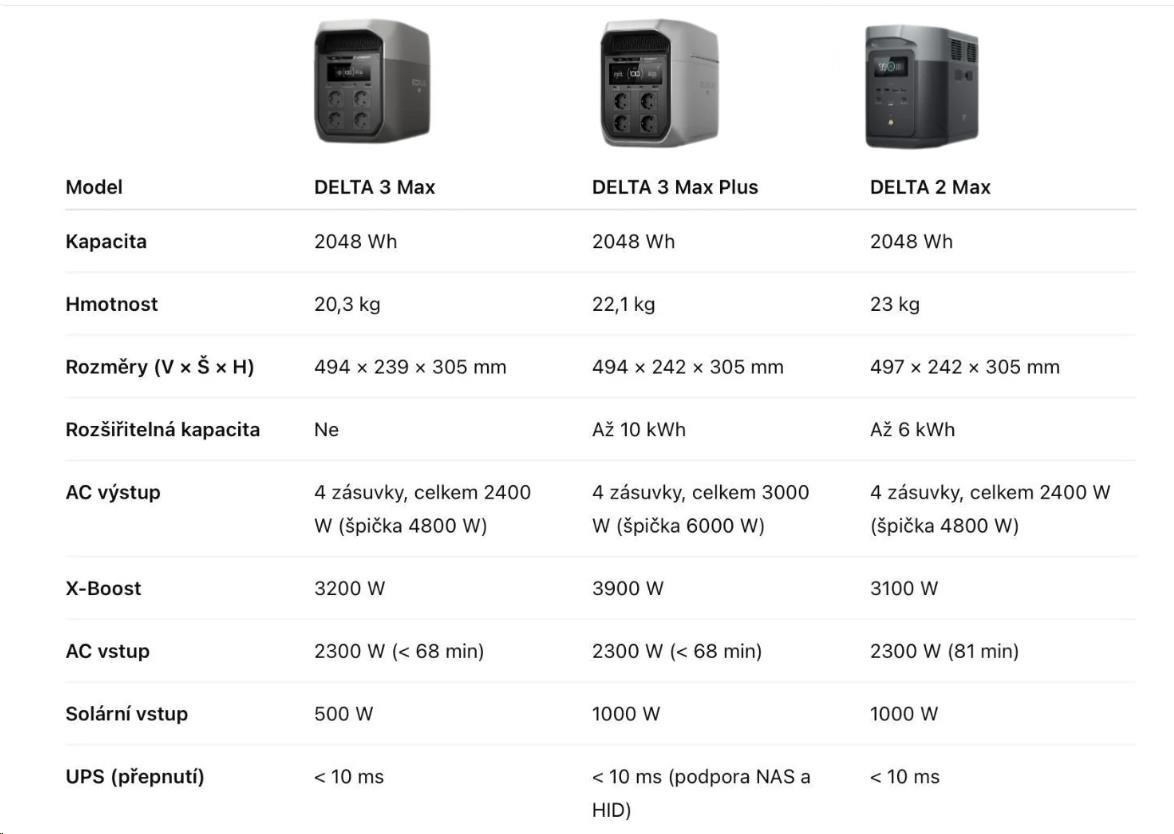| Kompatibilní přídavné baterie | DELTA 2 Max, DELTA 3 Max Plus, DELTA Pro 3, DELTA 3 přídavná baterie |
