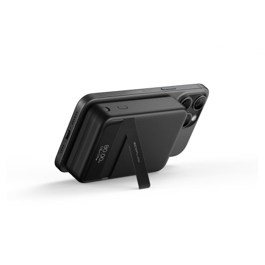 Tato powerbanka zároveň výborně kombinuje elegantní design s praktičností. To dokládá i zajímavý a praktický detail: Pevné magnetické uchycení mobilu pomocí magnetů N52 a vestavěný stojánek umožňují její využití i jako stojanu, který zajistí uchycení mobilu na podložce, a to v horizontální nebo vertikální poloze. Bude tak připraven například pro pohodlné sledování videí nebo četbu zpráv.