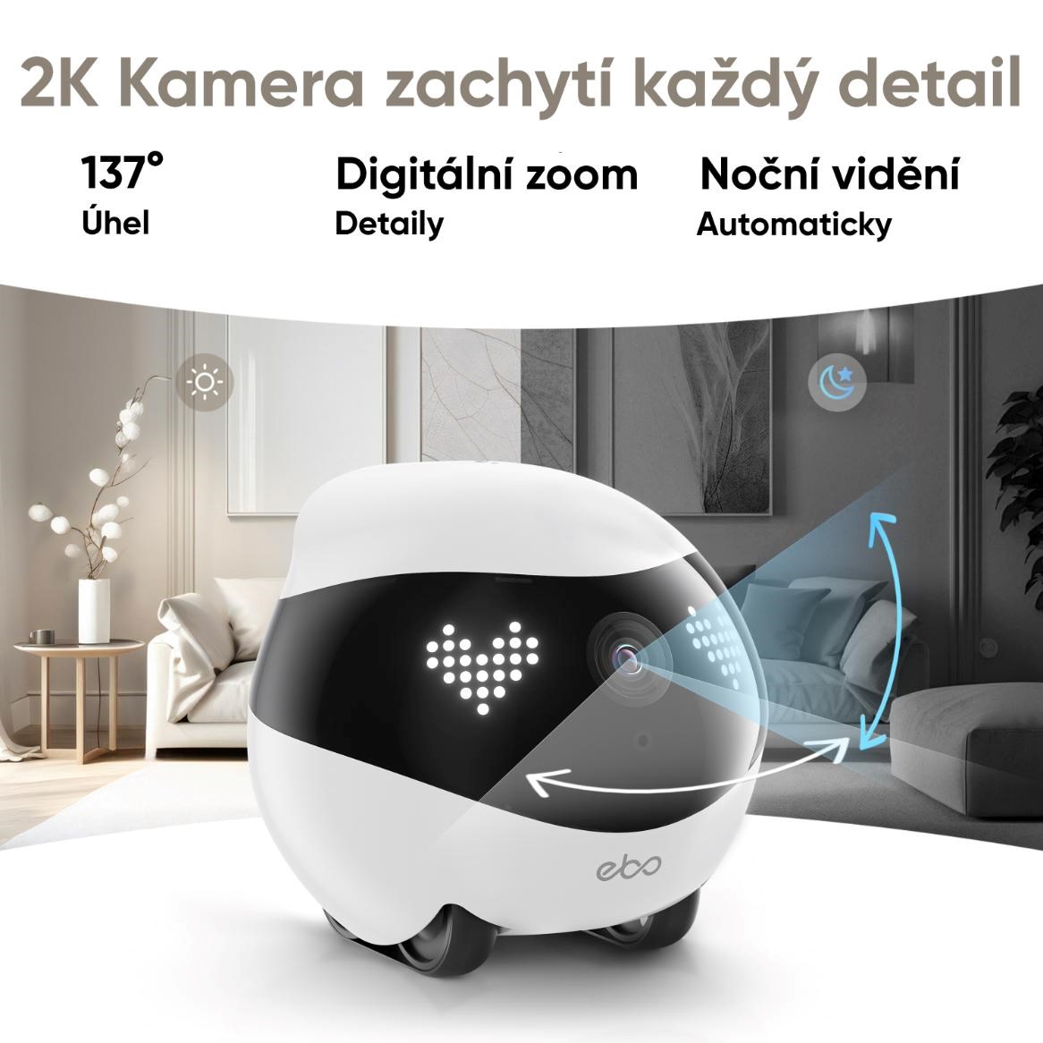 EBO Air 2 se dokáže volně pohybovat po celé domácnosti, čímž poskytuje mnohem širší dohled než běžné statické kamery. Díky pásovému podvozku zvládne plynulý pohyb po hladkých podlahách i kobercích a dokáže reagovat na vaše pokyny v aplikaci. Snadno tak zkontrolujete každou místnost nebo konkrétní situaci bez nutnosti fyzicky být doma a v případně abnormalit pošle notifikaci. Tato mobilita dává uživateli skutečný pocit přítomnosti – odkudkoli na světě.